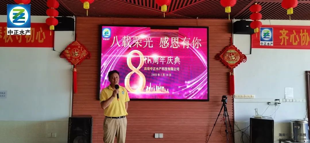 八載春秋守初心,齊心協力譜新篇。2022年7月18日,中正水產成立8周年慶祝大會在公司食堂隆重舉行。中正水產董事長雷夏雨、總裁雷秋涼、副總裁王平、生產部副總經理宋永強、各分公司代表及新龍基地全體員工參加了活動。